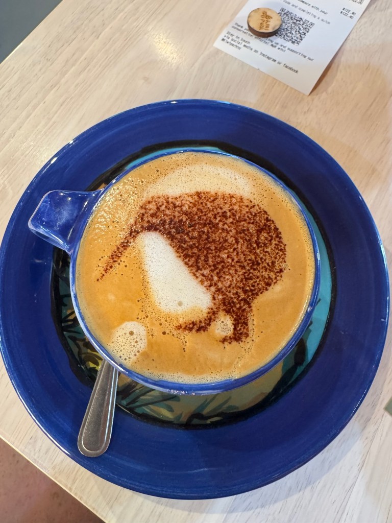 Had a second coffee at the Kiwi Sanctuary and whilst not as good as the MacKenzie one the Kiwi stencil used for the chocolate powder is great