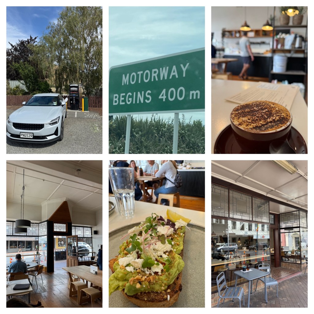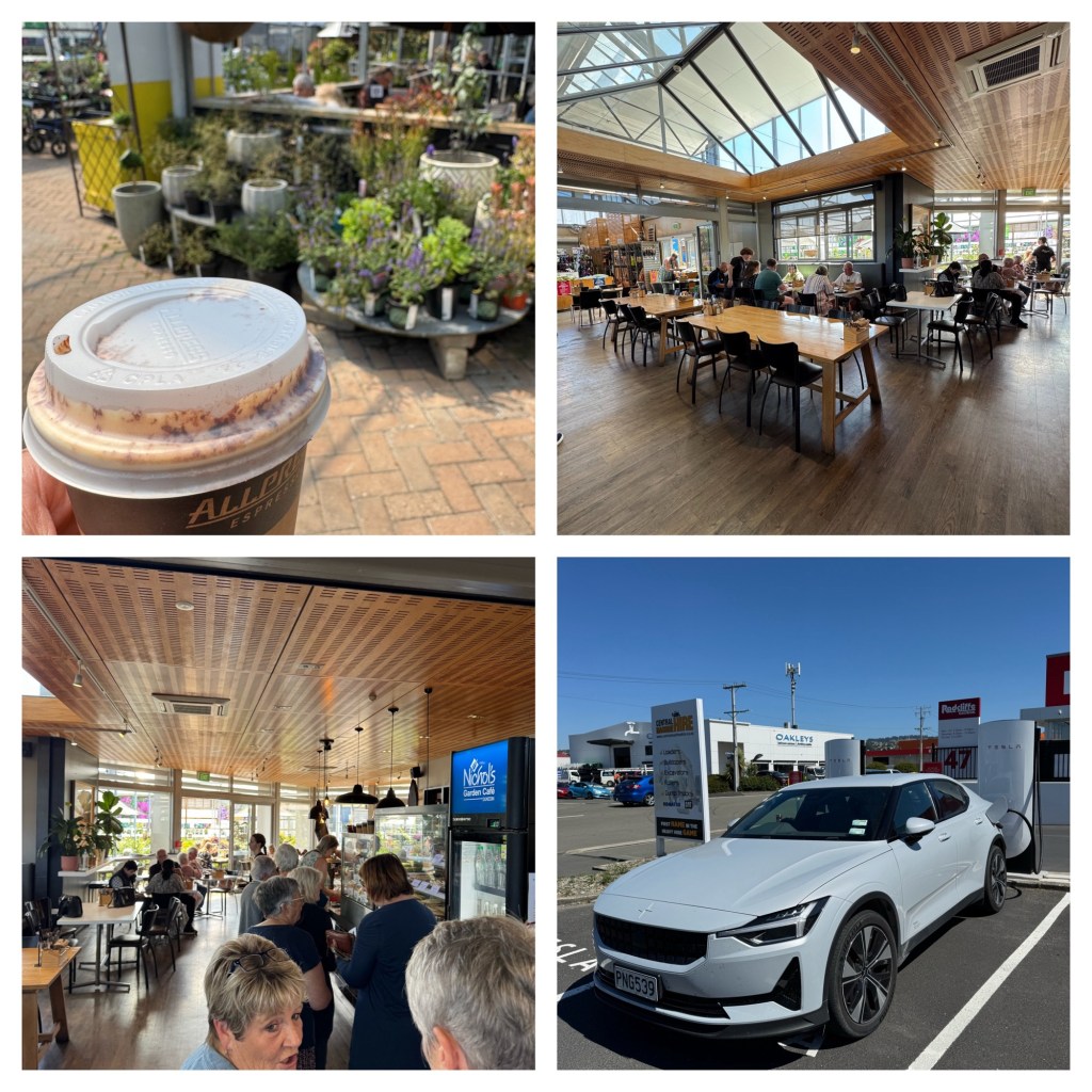 I took the car for a charge whilst Sharon was shopping. I’m in the middle of nowhere in an industrial type complex. Thought I’d check for coffee, not expecting anything close and Google tells me there is a cafe in the garden centre next door. I went in and it’s massive, more like a small garden centre attached to the cafe. Thought I’d have heaps of time to get a coffee, but seems every retired person in Dunedin was there and it took ages to get one. Car had almost charged before I got my coffee.