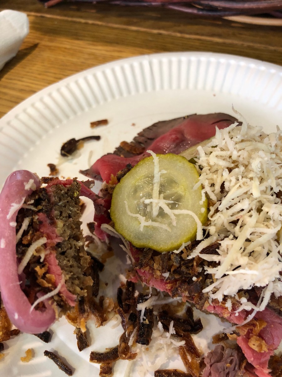 Wandered around for a while and the queue for the open sandwich (Smørrebrød) had died down so I ordered a roast beef one. It had roast beef, corn pickle, dried onion, pickles and onion. It was sensational, way better than the one yesterday which was chicken.