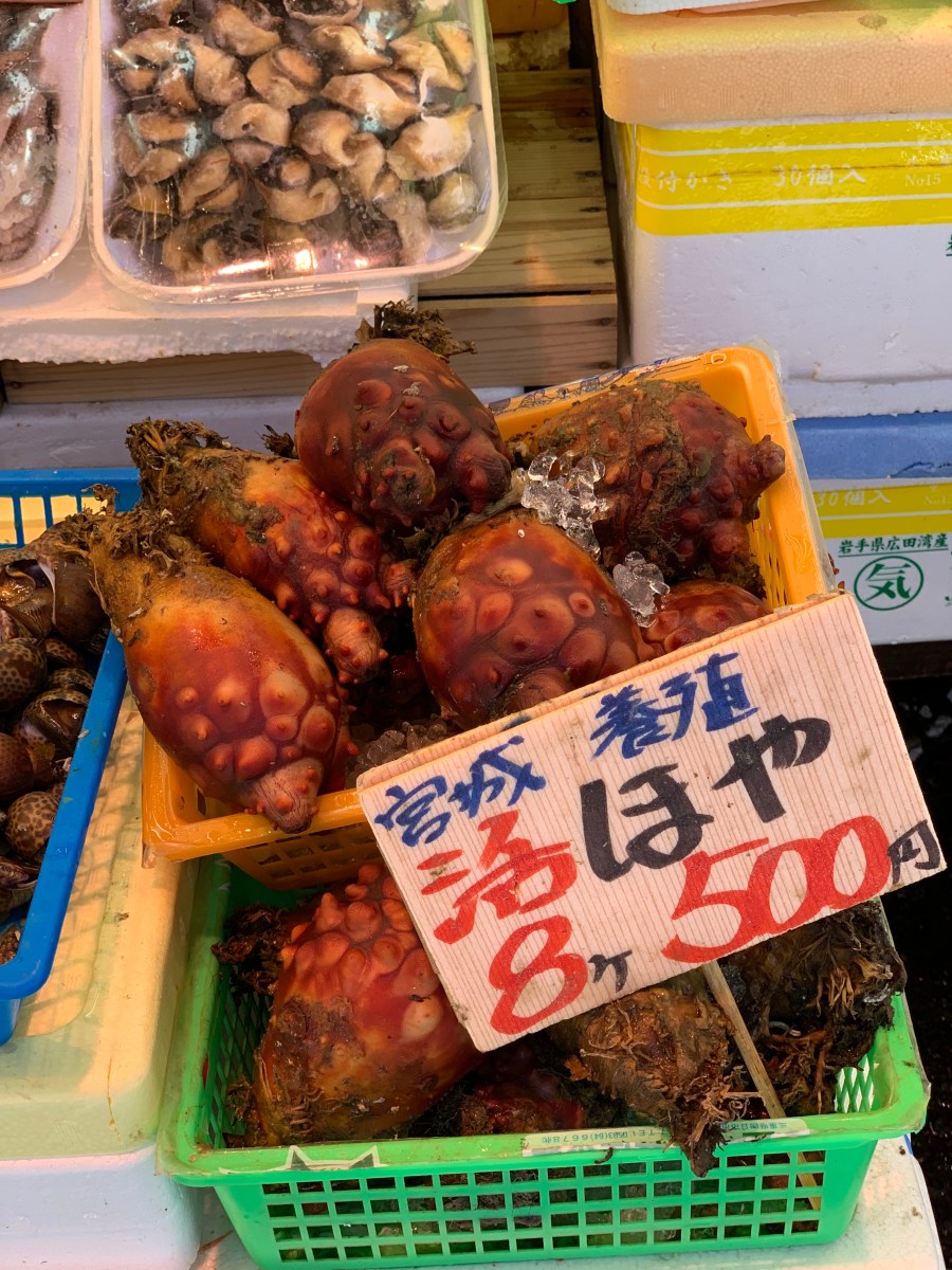 After this walked past a place selling lots of seafood. This is a sea pineapple. Never heard of it before.