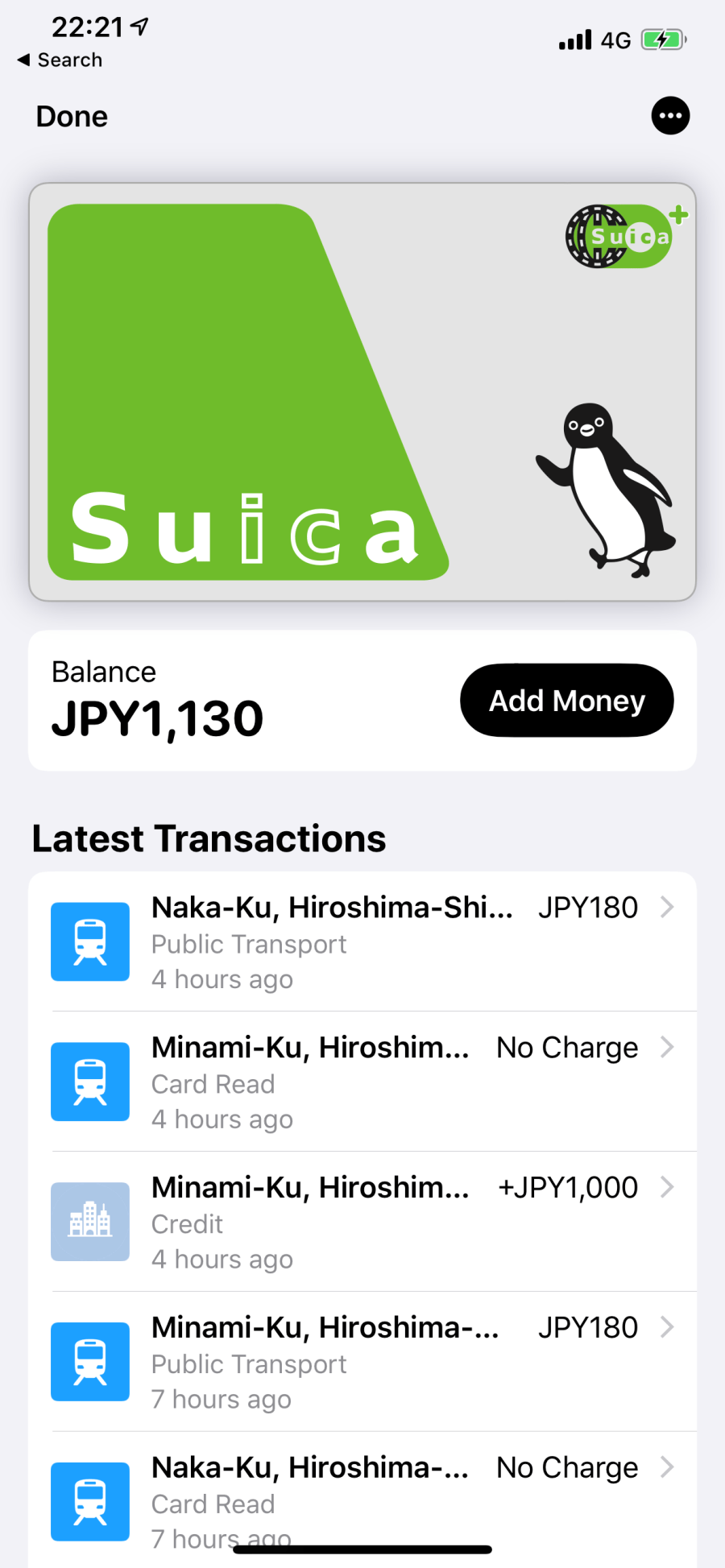 Here is what my SUICA card looks like in my Apple Wallet. I can see it balance at anytime and a history of trips. It will be great when Sydney’s Opal card has this.