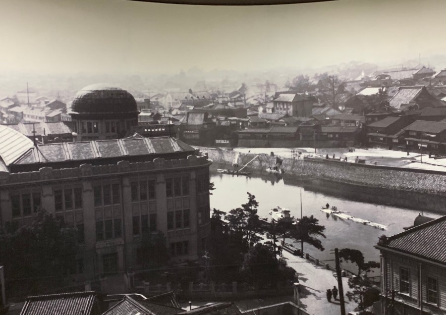 When the Americans dropped the bomb on August 6, 1945 they were aiming for a T shaped bridge called the Aioi Bridge. In the photo below I’m standing right where it was supposed to land, also shown on the map.
