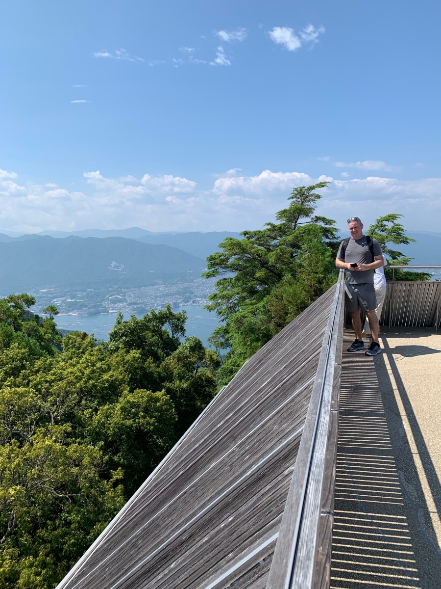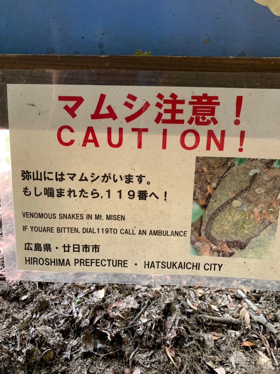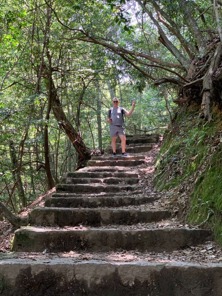 There was another sign saying you could hike the 2.5km up instead, but warned to take plenty of water. We had some water (luckily I’d bought a litre down at the ferry terminal). So off we went. It was almost 2.5km of stairs straight up. It made the walk we did along the Nakasendo Trail look like a walk in the park.