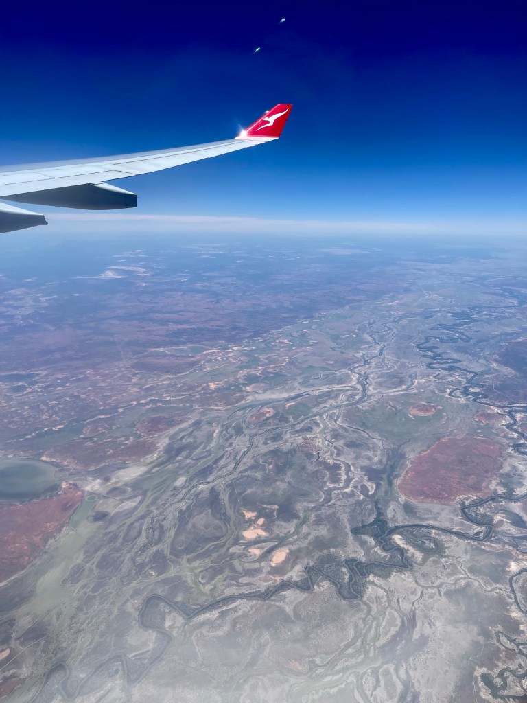 Even the rain and strong wind didn’t interrupt the takeoff. Of course Sydney was the only part of Australia that had rain today, 10 minutes in the sky and most of the cloud cover disappeared and we had great views over the Darling river just before crossing into SA then NT. Unfortunately this time we tracked a little north of Uluṟu and didn’t get to see the rock.