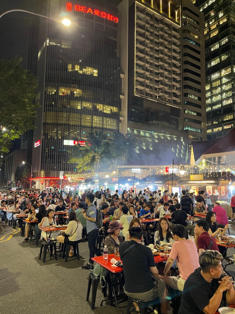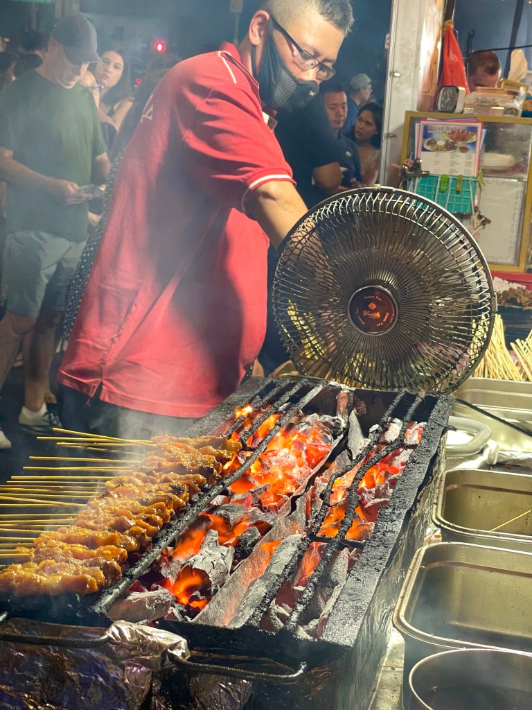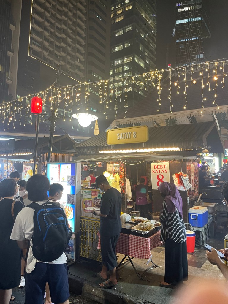 Satay St is pretty much everything that Singapore isn’t, it’s absolute chaos and Smokey, however just like everywhere else in Singapore the food is excellent. We decide to get our Satay from the “Satay 8” stall vendor. A bit of googling indicates this is one of the best Satay places on the island, and the queue for this place was massive. All the other vendors were touting for business, but not the blokes at Satay 8.