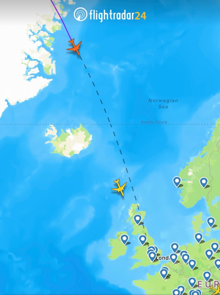 However that changed with recent global events and that airspace is closed again so it’s added a few hours to the flight and now tracks east through the Bering Strait over northern Canada, down through Greenland, over Scotland and into London that way. I was excited that I would see lots of ice, look towards the North Pole, maybe see an iceberg or two…..