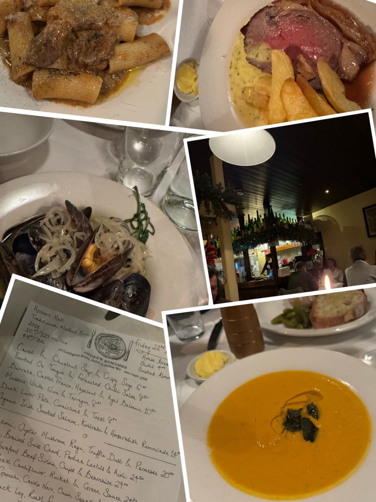 Last night we caught up with my cousin and her partner who we haven’t seen in a number of years. We spent a few hours looking at the Christmas lights around central London. They are as spectacular as I was hoping. After a wander we went out for dinner at Andrew Edmunds in SoHo, fantastic little restaurant serving “Modern European” meals. I had the steak and frites which was delicious. I’ve never had carrot and chestnut soup either, which was equally delicious. The chestnut was a very subtle flavour. Would highly recommend this restaurant if you are ever in SoHo in London.