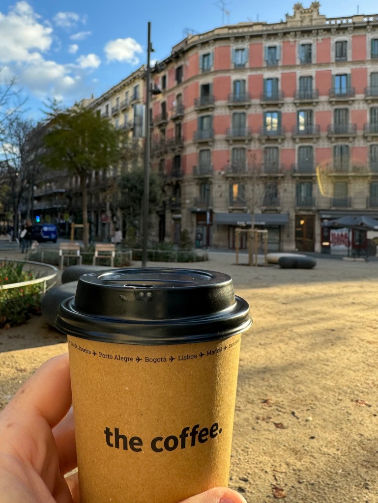 Found a great coffee bar here in Eixample, just a block from our apartment. All they do is coffee (plus one or two pastries) so they have to be pretty good, they have nothing to hide behind. This morning was a lovely sunny morning (although brisk being winter). So I had my coffee sitting in this lovely little square near Girona metro station.