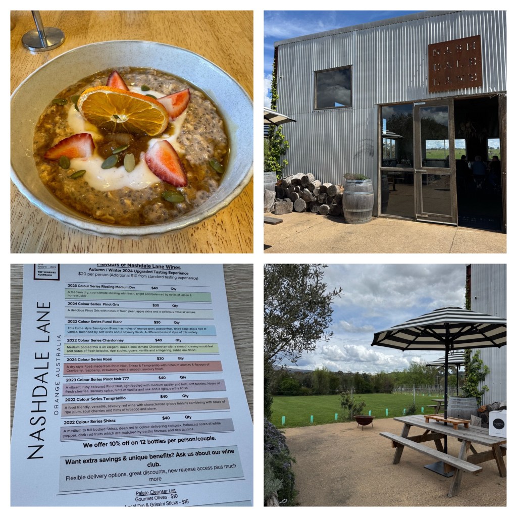 After breakfast, started the day with a visit to a winery just a few minutes out of town : Nashdale Lane. They were all great but I had a real liking for the Pinot Noir. Of course, we purchased a box of wine. Leaving the winery carrying the box some smarty on the way in suggested I was walking out with a box of problems, I suggested they are actual a box of solutions to one’s problems….